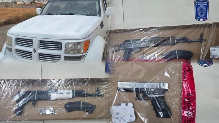 Además, los agentes aseguraron tres cargadores de plástico negros, cada uno con diez cartuchos útiles calibre 7.62×39. En el vehículo también localizaron dos armas cortas de utilería, una de plástico negro y otra de plástico color marrón, ambas sin cargador, lo que descartó que fueran funcionales al momento del hallazgo.