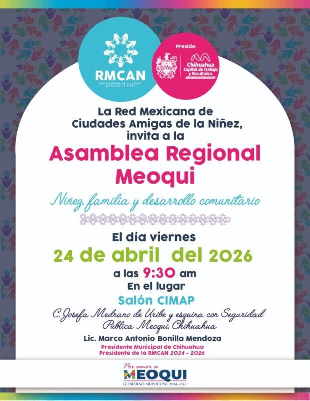 Este viernes, el municipio de Meoqui será sede de la Asamblea Regional Niñez, familia y desarrollo comunitario de la Red Mexicana de las Ciudades Amigas de la Niñez (RMCAN), encuentro que reunirá a representantes de 15 municipios y contará con la presencia de Marco Bonilla, presidente nacional de la red, esto con el objetivo de esta asamblea es promover el intercambio de experiencias exitosas entre municipios, con el fin de fortalecer la implementación de políticas públicas que garanticen los derechos de niñas, niños y adolescentes.