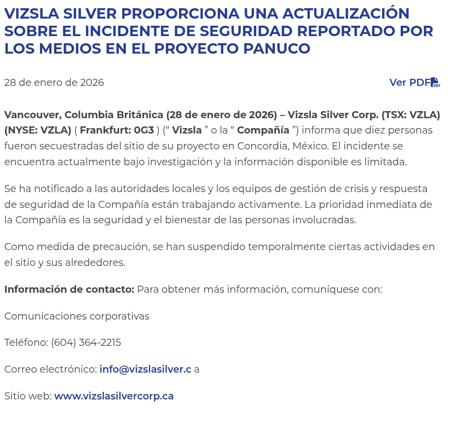 “Vizsla Silver Corp. (TSX: VZLA) (NYSE: VZLA) ( Frankfurt: 0G3 ) (“ Vizsla ” o la “ Compañía ”) informa que diez personas fueron secuestradas del sitio de su proyecto en Concordia, México. El incidente se encuentra actualmente bajo investigación y la información disponible es limitada.