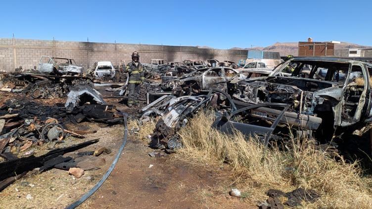 Un incendio iniciado por la quema de hierba seca por un adulto mayor que cuidaba un predio donde se guardan vehículos yonkee se salió de control y calcinó en su totalidad 22 vehículos en desuso, el siniestro ocurrió en la calle Valle de la Nube, cruce con Tricentenario, Colonia Granjas del Valle.