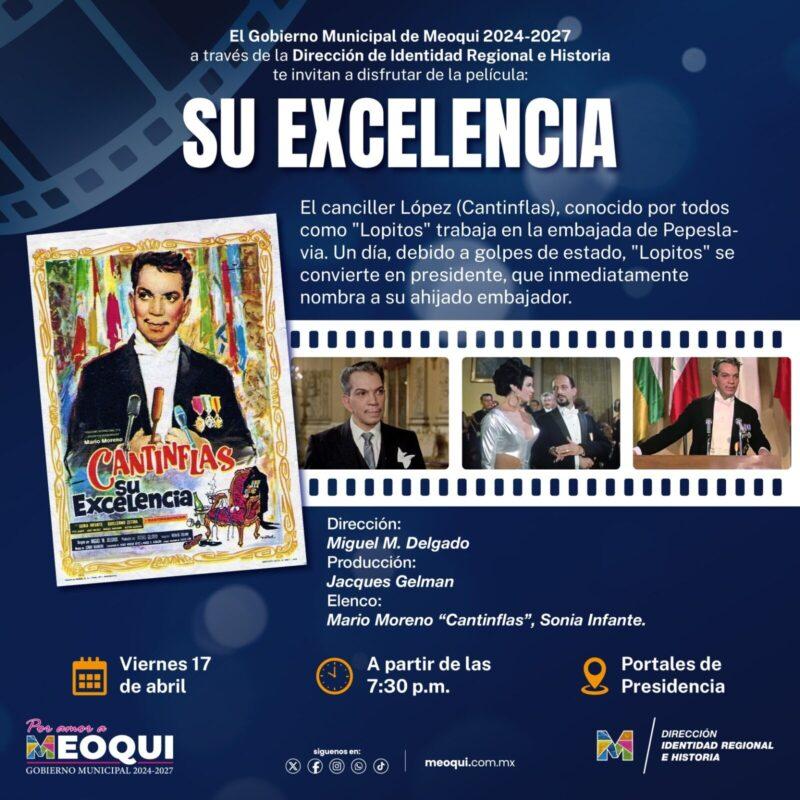 Este viernes 17 de abril regresa a Meoqui el tradicional Cine Club Histórico con la proyección de la película “Su Excelencia”, protagonizada por Mario Moreno “Cantinflas”, la cual se llevará a cabo a partir de las 7:30 de la tarde en los portales de la Presidencia Municipal. Por ello, el Gobierno Municipal hace una cordial invitación a todas las familias para disfrutar de esta actividad.