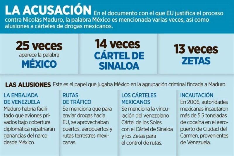 En la acusación por «narcoterrorismo y tráfico de cocaína a Estados Unidos» en contra de Nicolás Maduro, la palabra México aparece en 25 ocasiones.