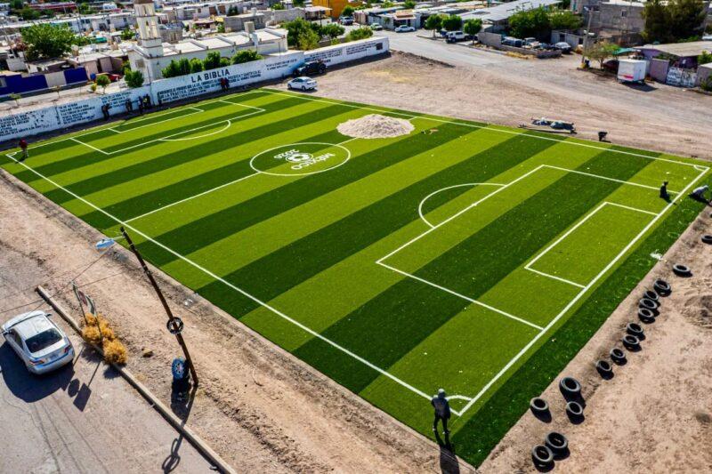 La Arq. Miriam Soto mencionó que se trata de dos canchas, una de 7×7 y otra de 5×5, que contemplan trabajos como cercado perimetral, pasto sintético, porterías, iluminación y todos los elementos necesarios para su correcto funcionamiento. De acuerdo con lo informado, ambas obras presentan avances importantes y se prevé que queden concluidas a finales del mes de mayo.