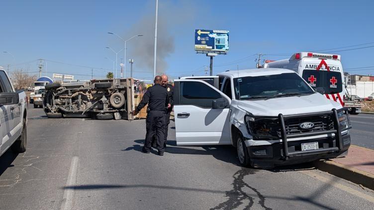 Unidad de inteligencia municipal chocó con camioneta en av. Tecnológico; la camioneta Nissan NP 300 perdió la suspensión lo que hizo que perdiera el control chocará y terminará volcando.