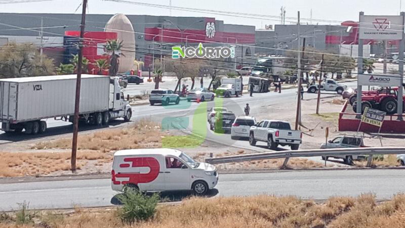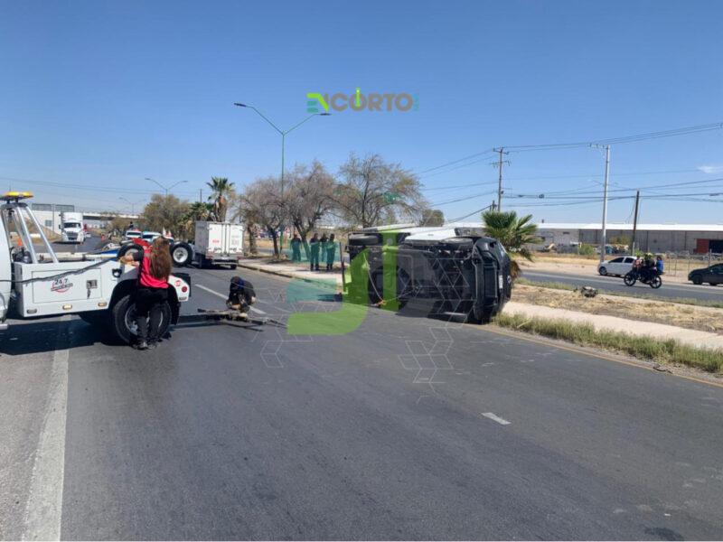 Delicias, Chih.- La mañana de este miércoles, antes de las 12:00 horas, se registró la volcadura de una camioneta que transportaba carne sobre la carretera federal 45, a la altura de la empresa Cimarrón.